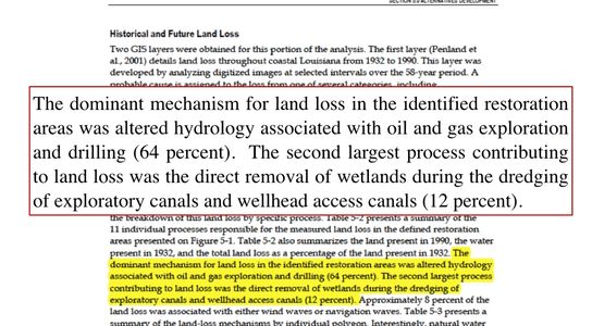 At least 34 scientific studies, including studies done by the oil and gas industry itself and dating back as far as 1971, conclude that oil and gas activities contributed to Louisiana’s coastal land loss. In 1985 a study commissioned by Louisiana Mid-Continental Oil and Gas Association concluded that oil and gas activities contributed to coastal land loss. The other studies were conducted by the likes of US Army Corps of Engineers, National Oceanic and Atmospheric Administration, Louisiana Geological Survey, LSU Center for Wetland Resources, Louisiana Coastal Restoration and Protection Authority, and a number of other federal agencies and private engineering firms. Many of the studies concluded that the majority of the land loss in some areas, as much as 80%, is due to oil and gas activities.